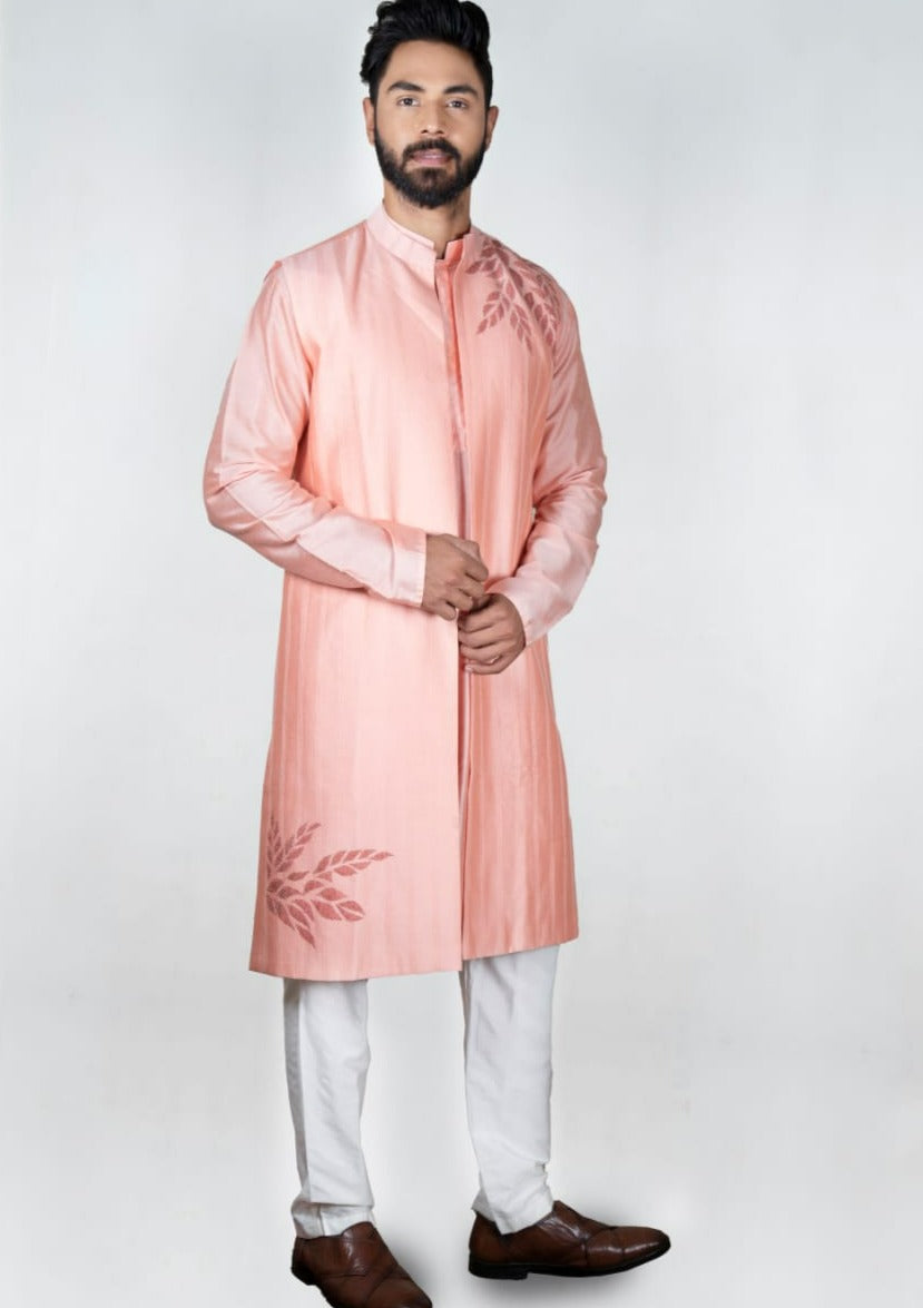 CRISS CROSS PINTUX ON THE YOKE OF KURTA, FRONT OPEN LONG JACKET, ANCOR STITCH LINE ALL OVER JACKET, LEAF APPLIQUE IN JACKET, FITTED PAJAMA BOTTOM