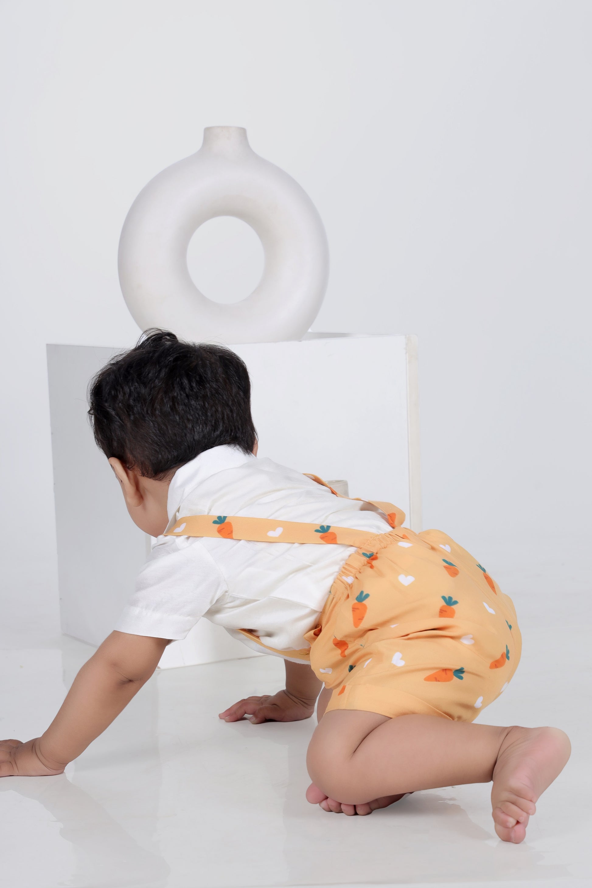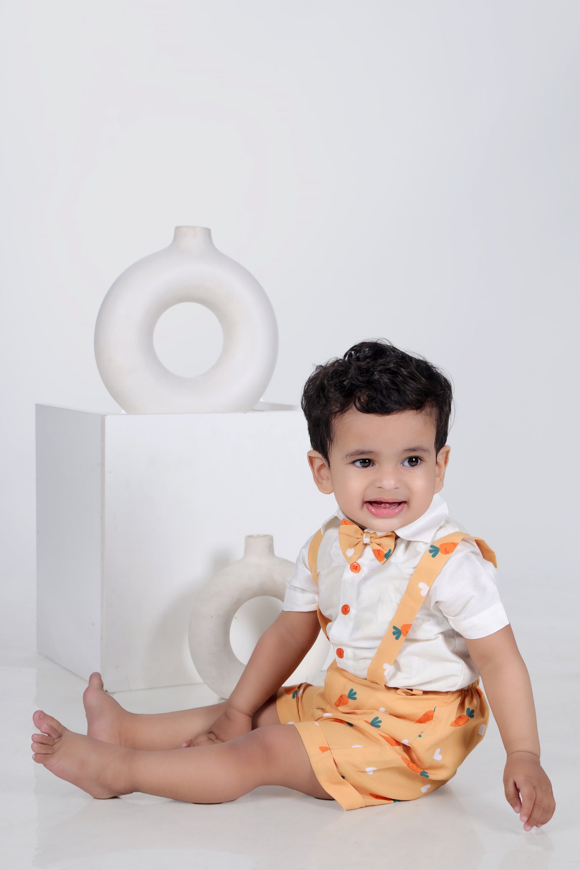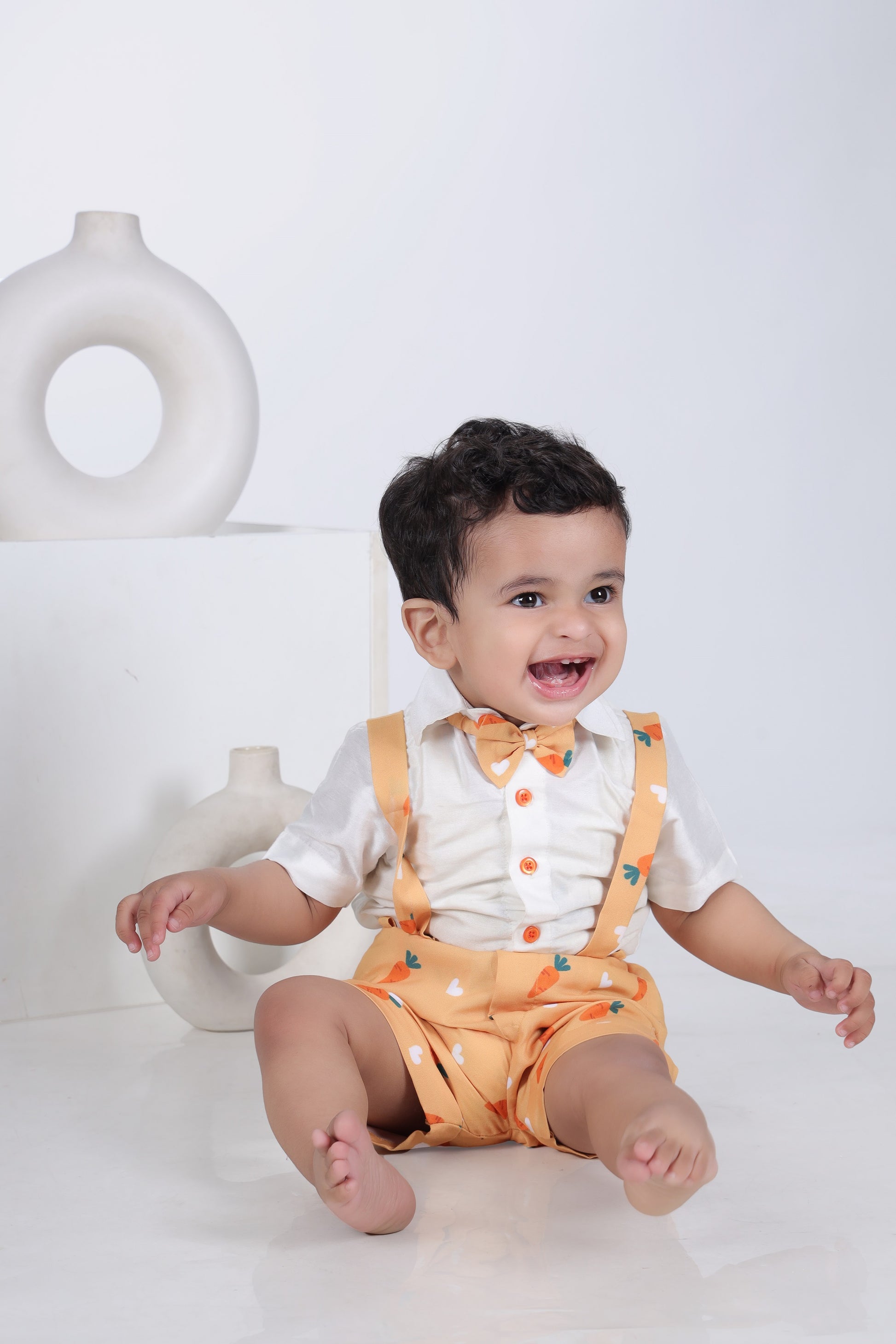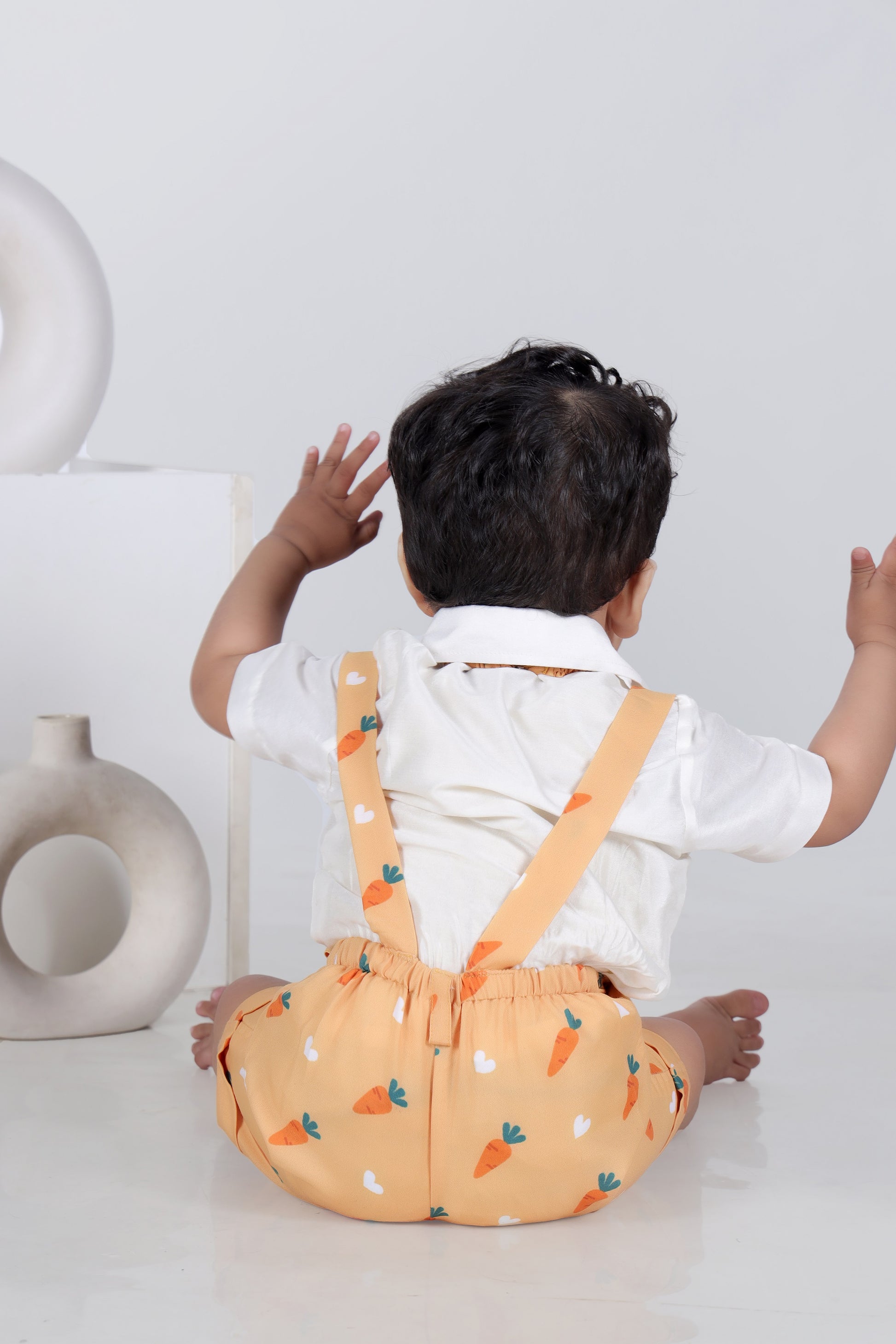 White Half Shirt/Orange Carrot Print Half Pant Suspenders And Bow Tie Set