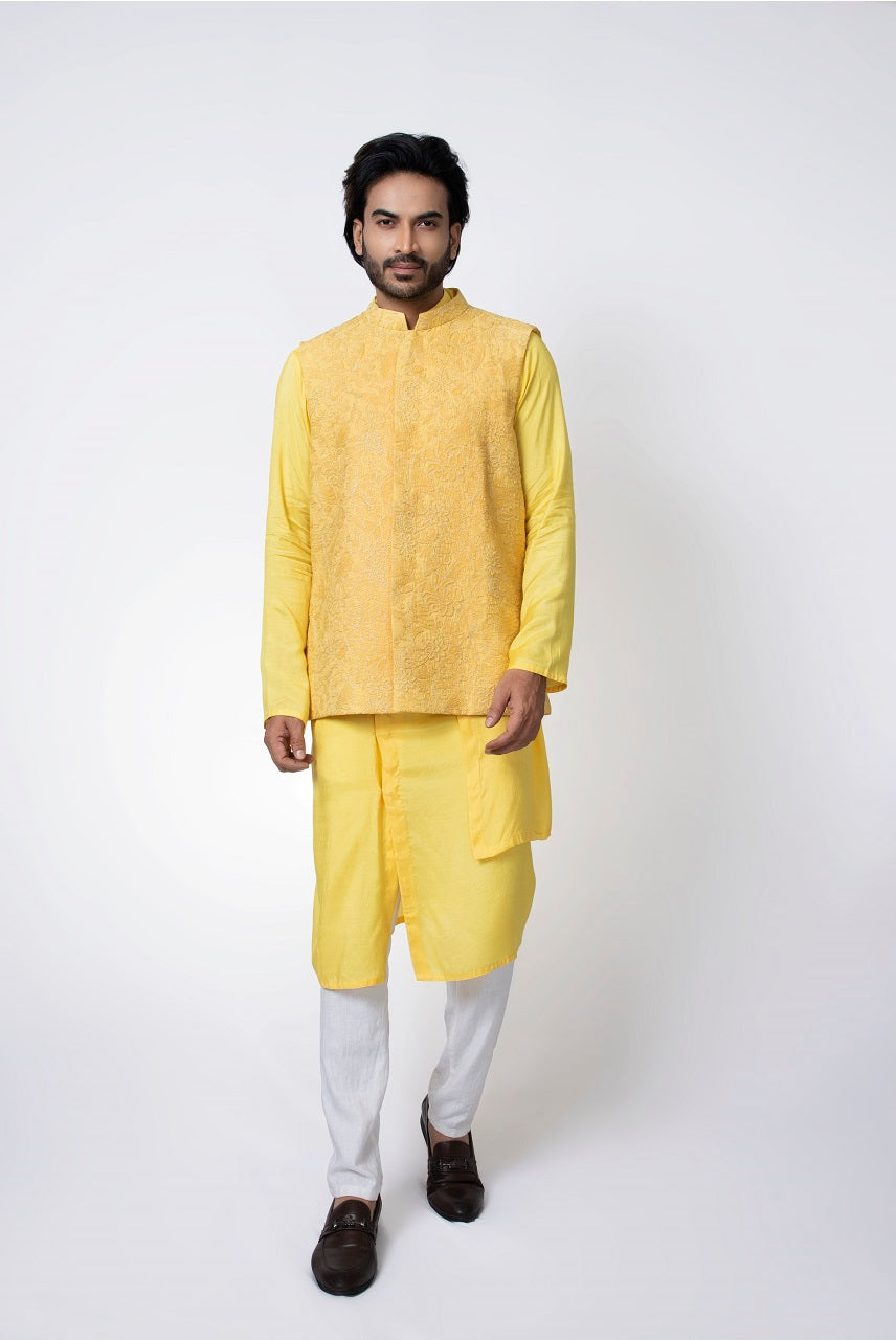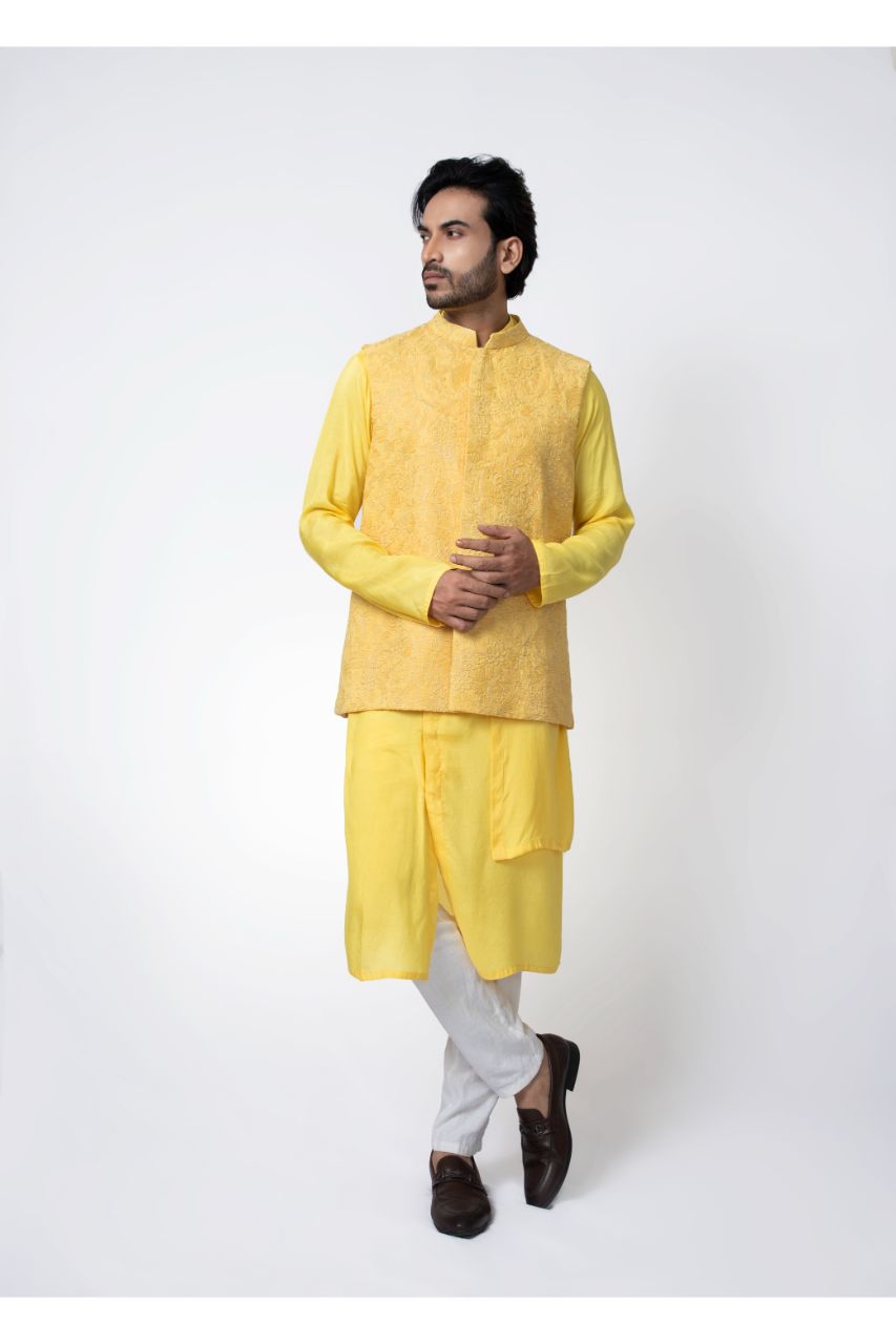 Yellow Layer Stylish Kurta With Heavy Emroidered Bundi Pajama Set