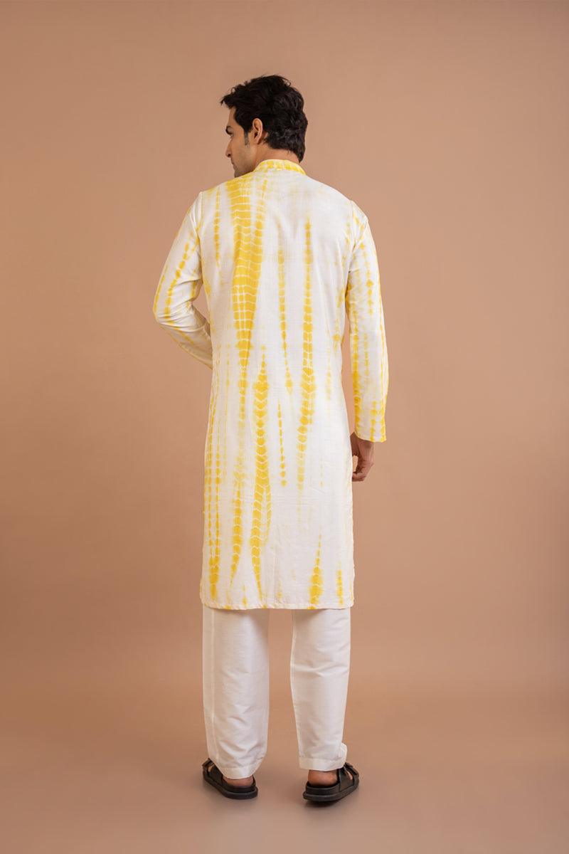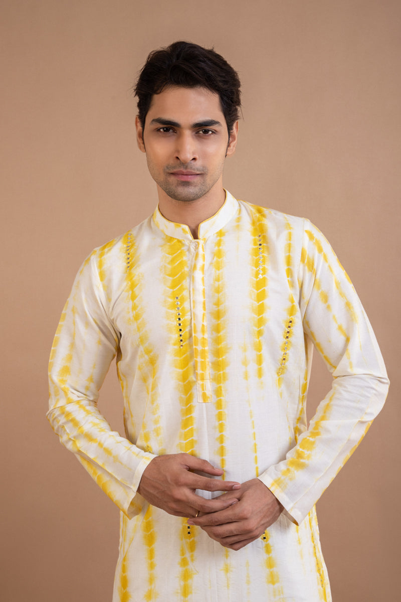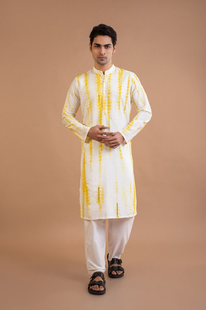 TIE AND DIE KURTA, MIRROR WORK ALL OVER KURTA, OFF WHITE PAJAMA BOTTOM